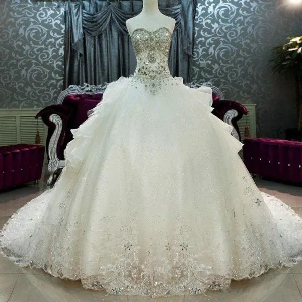 Luxurious sweetheart ball gown wedding dress 2018 crystal beadings long train. Crisscrossing straps and a corset back complete the look. Only 2 available and it's in 6 people's carts. Crystal beaded tulle ball gown prom dress. Luxury wedding dress crystal off the shoulder strapless ball gown lace beading applique hand made bridal dress long train lace up plus size online.